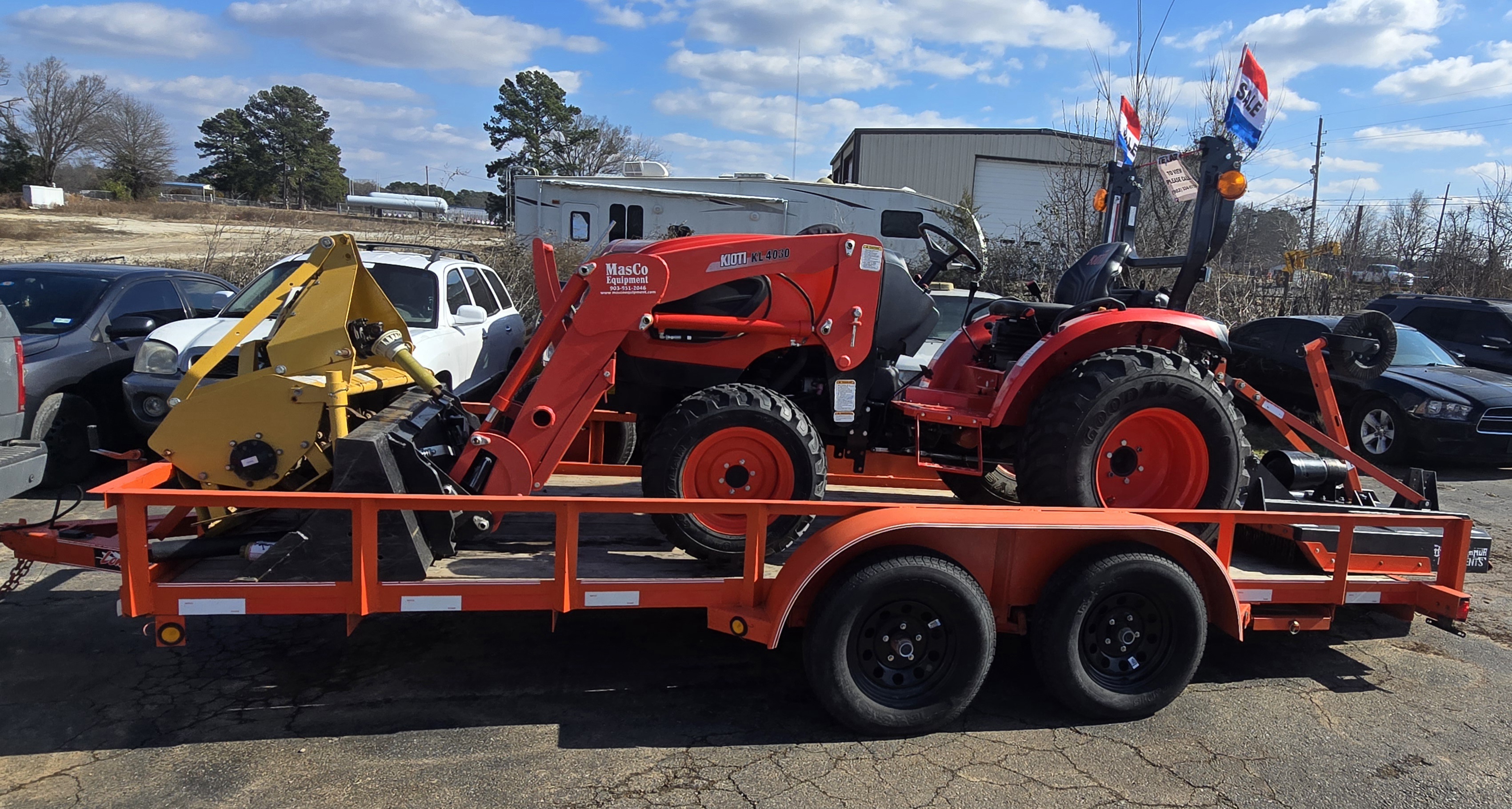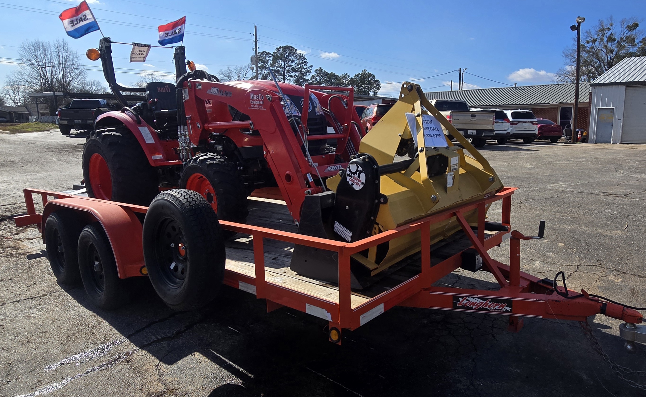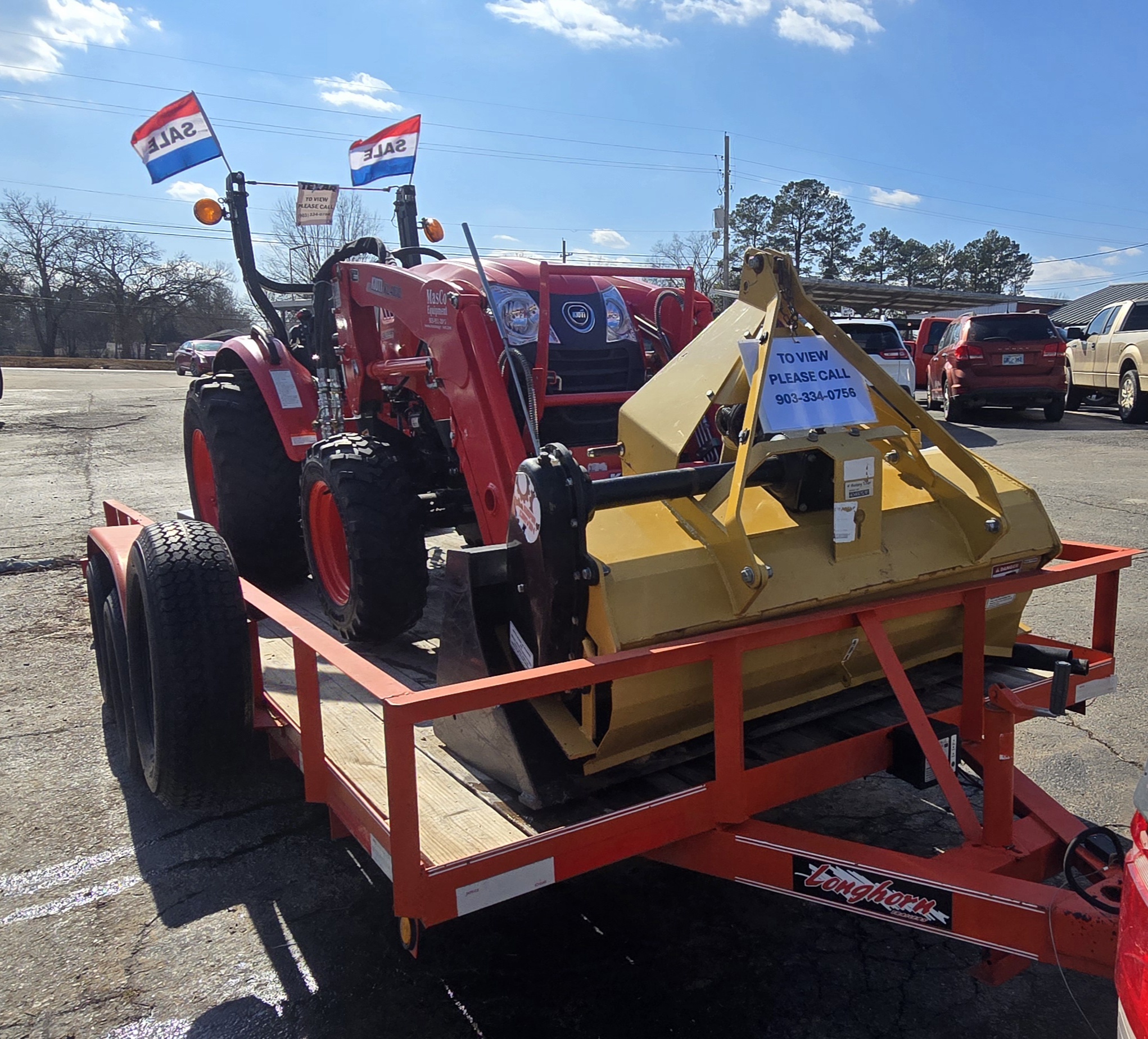 Details: 2022 Kioti Tractor CK2610HB FWD, 2022 Kioti KL4030QA60 with grill guard, 2021 Roto Tiller, 2019 Bush Hog 5", & 2023 Longhorn 16'X77" Utility Trailer with spare wheel. This unit is sold as a bundle.