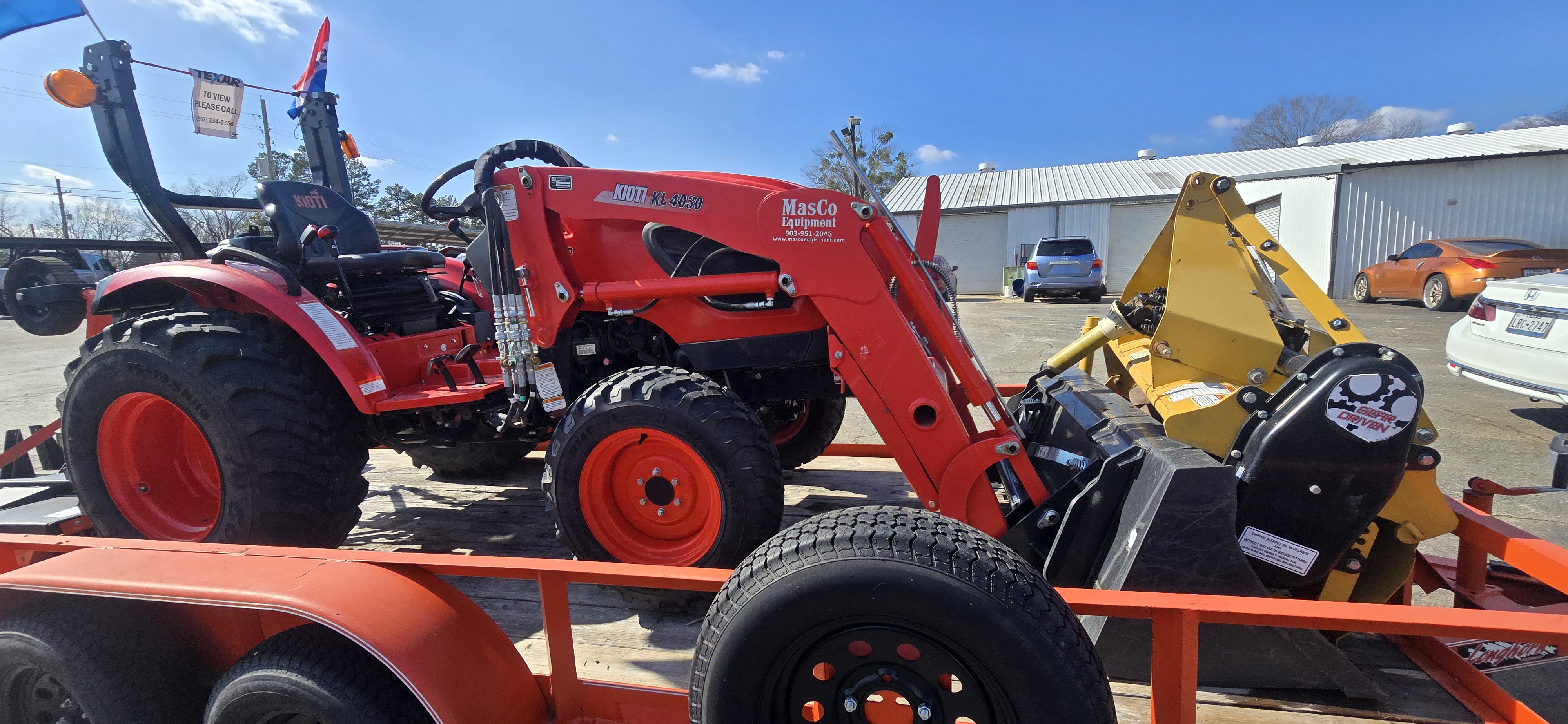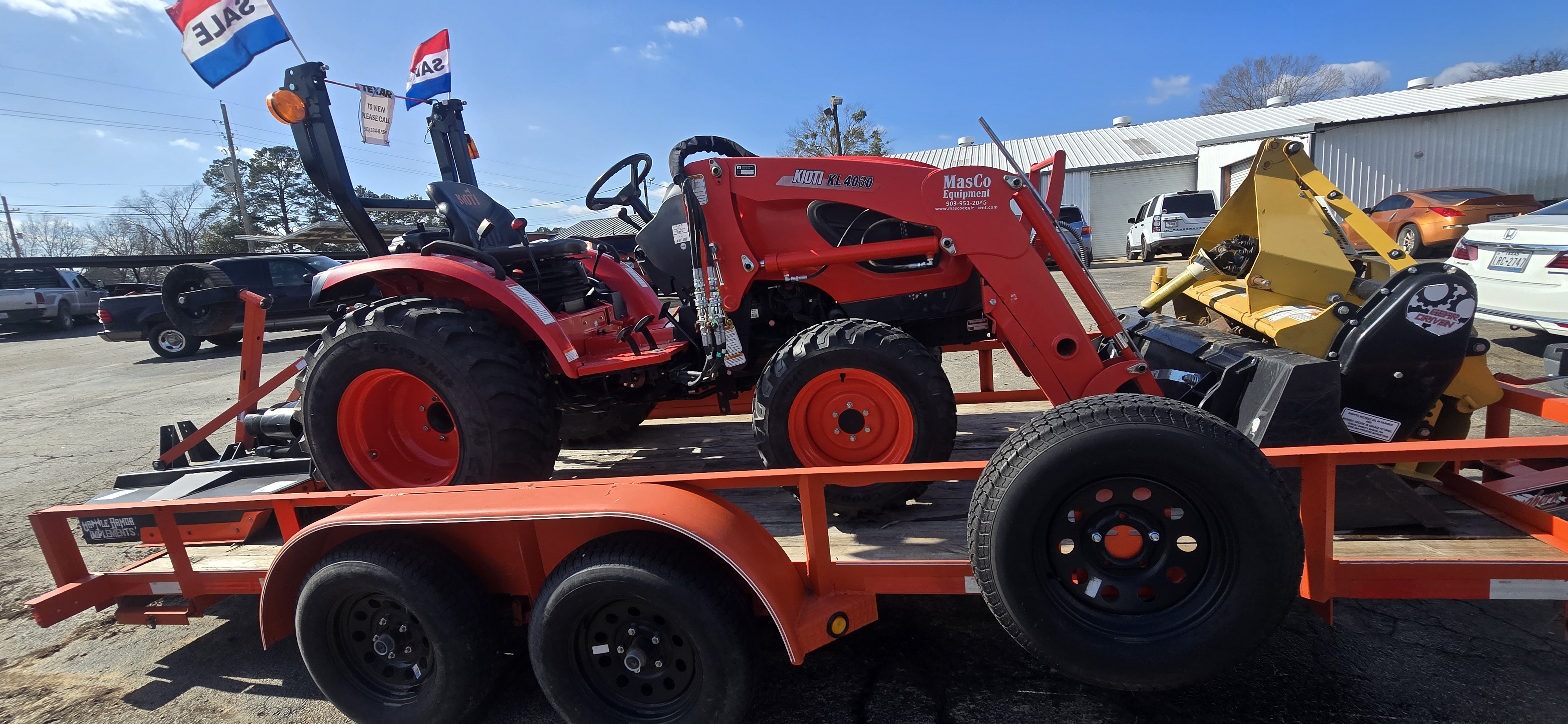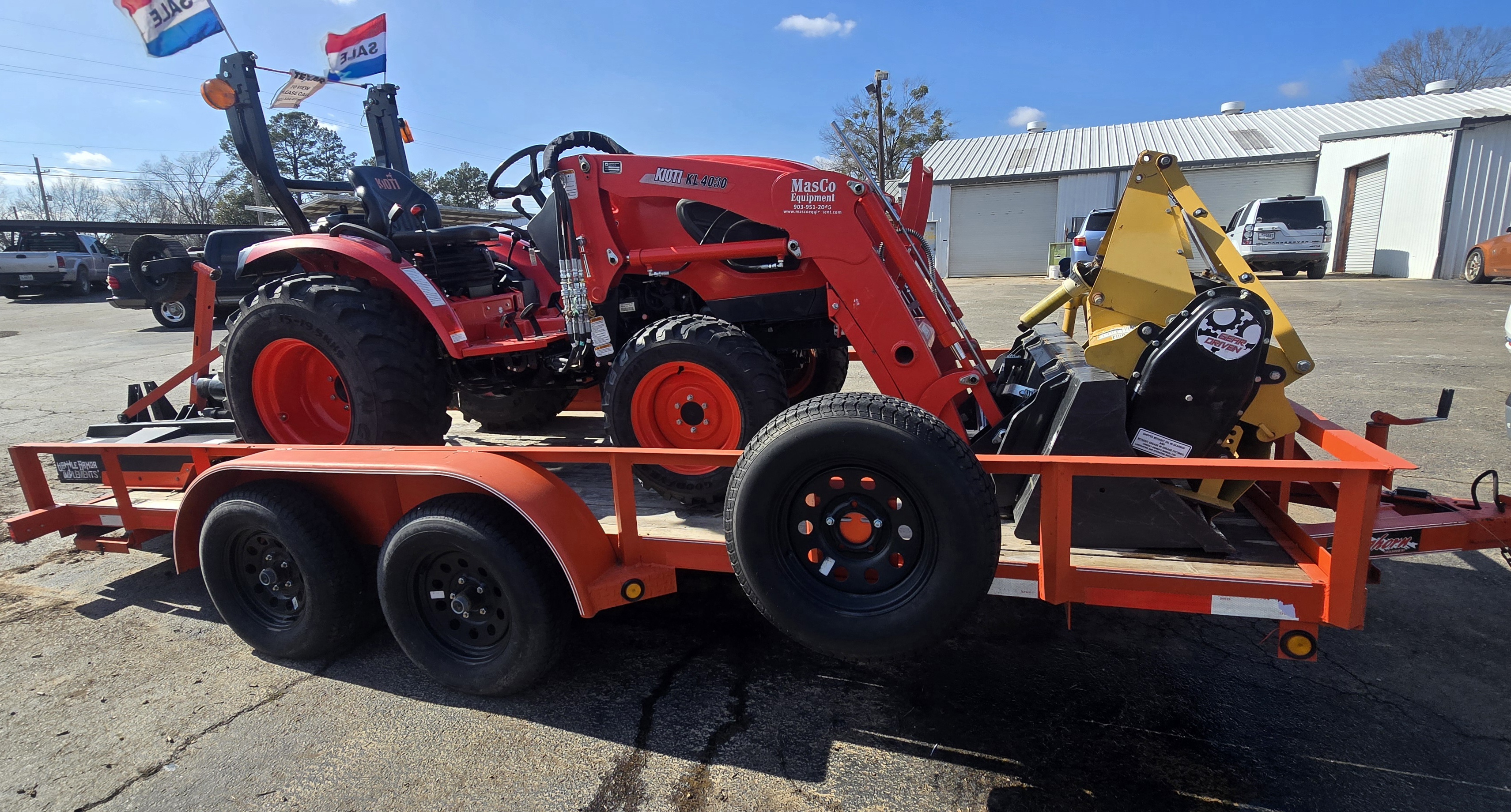 Details: 2022 Kioti Tractor CK2610HB FWD, 2022 Kioti KL4030QA60 with grill guard, 2021 Roto Tiller, 2019 Bush Hog 5", & 2023 Longhorn 16'X77" Utility Trailer with spare wheel. This unit is sold as a bundle.